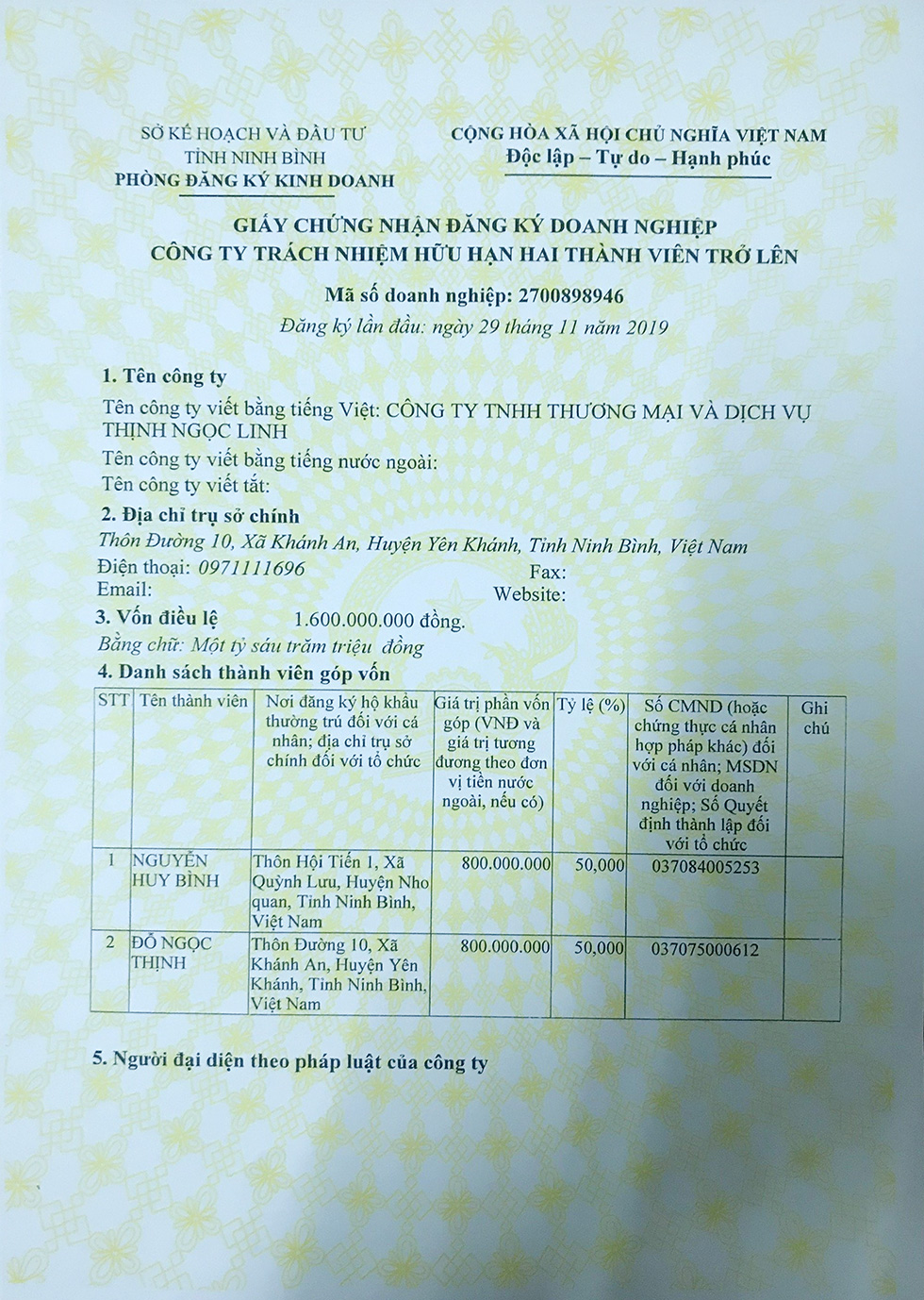 - Người đại diện pháp luật : Giám đốc – Đỗ Ngọc Thịnh